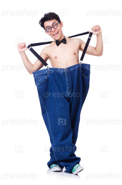 Забавный человек с брюками, изолированный на белом