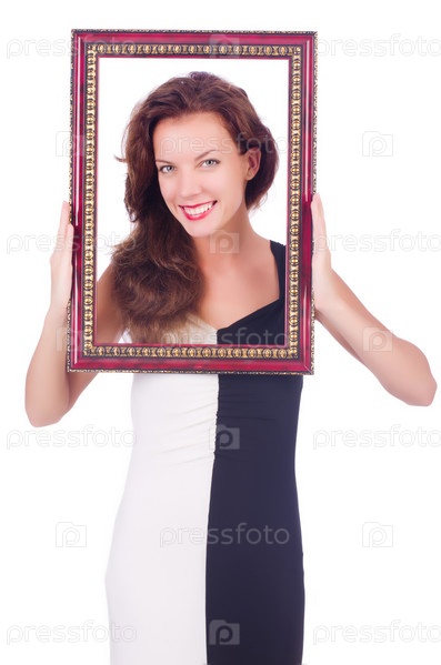Женщина с фоторамкой на белом фоне