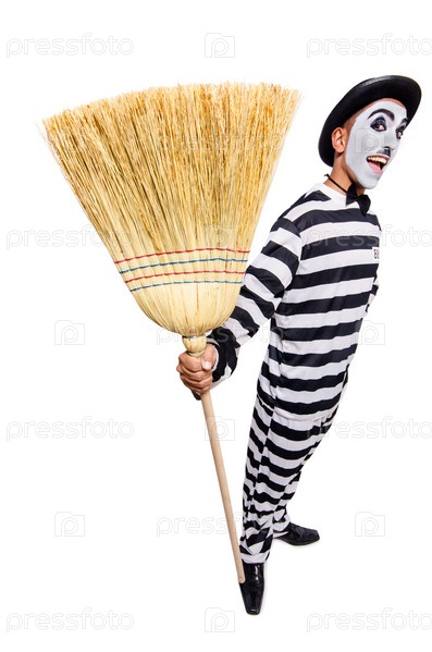 Заключенный с метлой, изолированный на белом