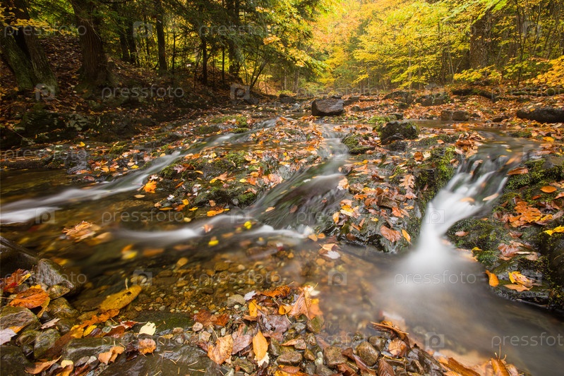 Горный ручей с небольшими водопадами и золотые осенние листья