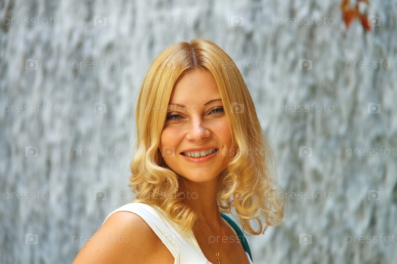 Привлекательная девушка на фоне искусственного водопада