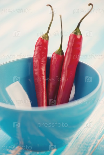 Голубая чашка с красным перцем чили, крупный план
