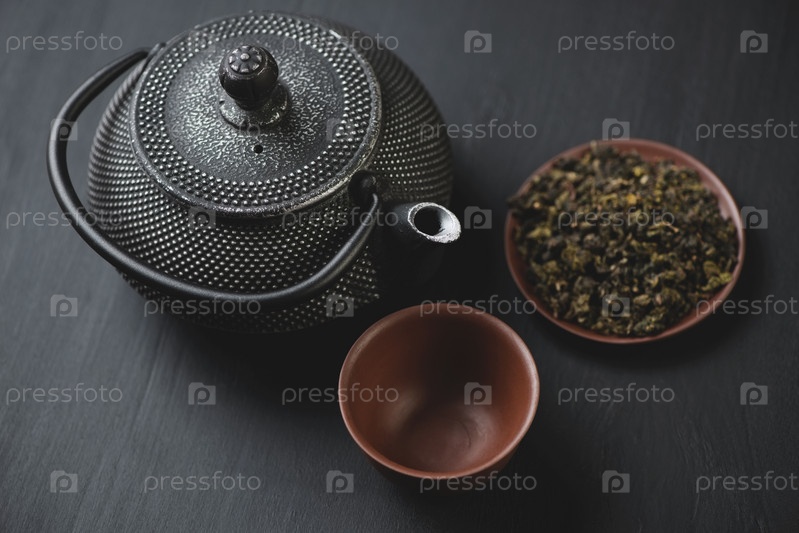 Чугунный чайник и зеленый чай, темный деревянный фон