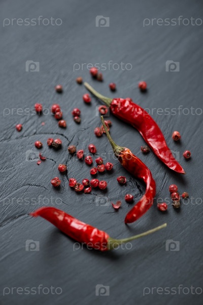 Разновидности красного перца на черном деревянном фоне