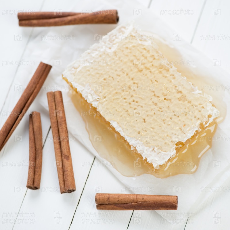 Медовые соты и палочки корицы, вид сверху