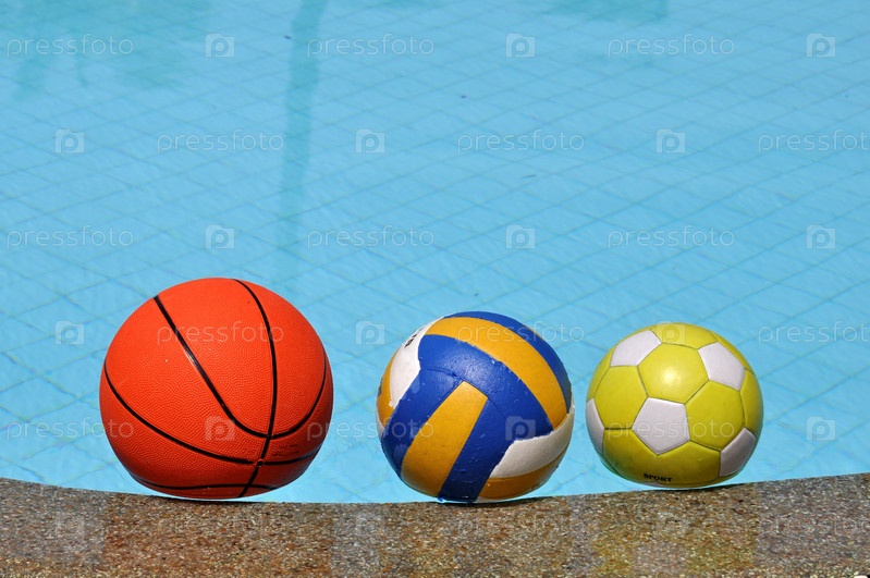 Спортивные мячи плавают у края бассейна