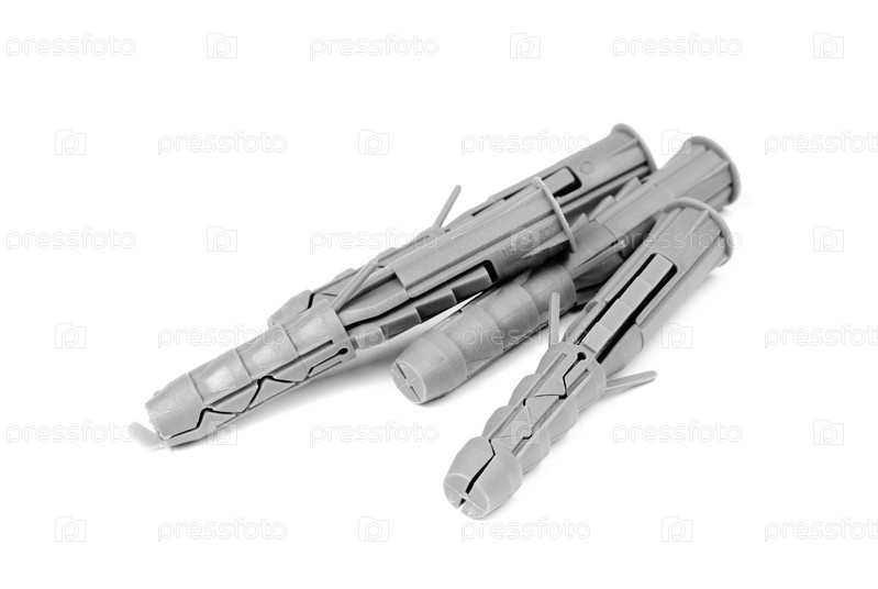 Три пластиковых дюбеля на белом фоне