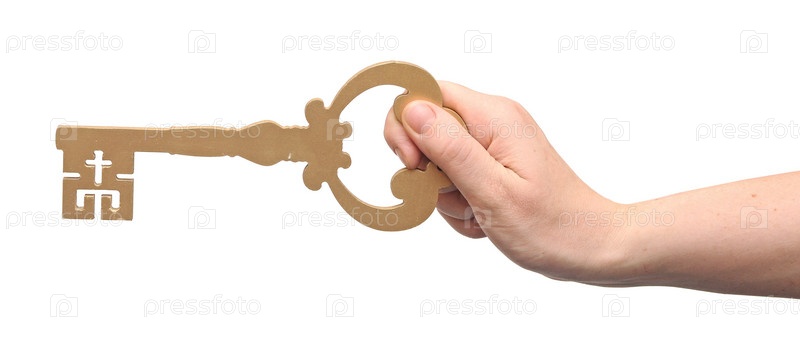Золотой ключ в человеческих руках, изолированныц на белом фоне
