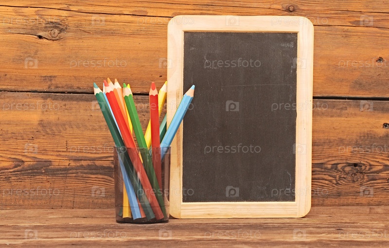 Деревянная чистая доска и цветные карандаши