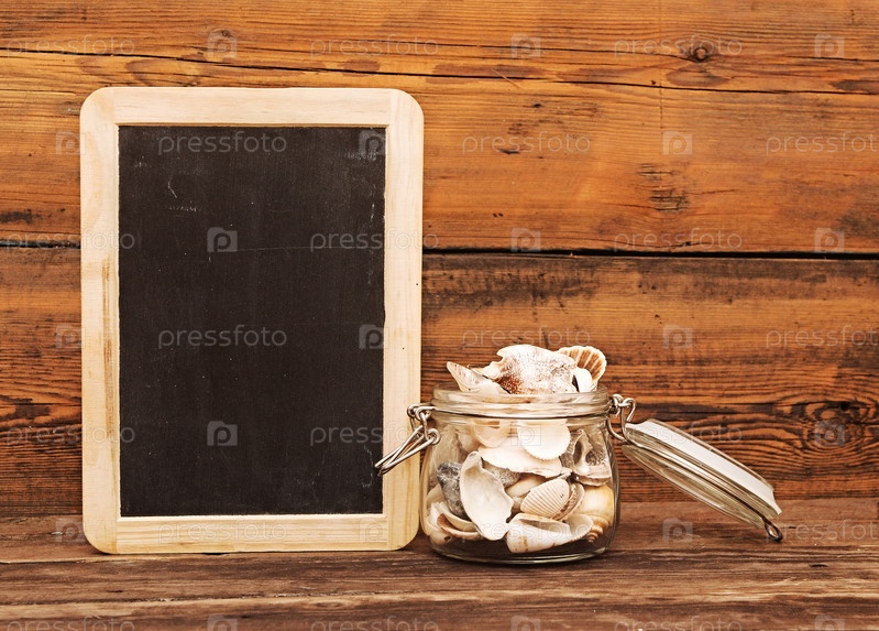 Ракушки в банке на деревянных фоне