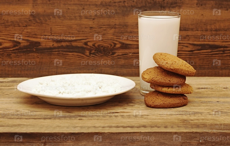 Стакан молока и овсяное печенье на деревянном фоне