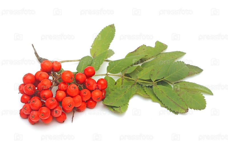 Красная рябина и зеленые листья, изолированные на белом фоне