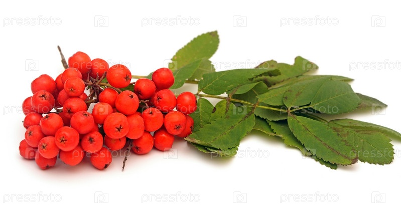 Красная рябина и зеленые листья, изолированные на белом фоне
