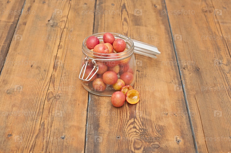 Сливы в стеклянной банке на старом деревянном столе