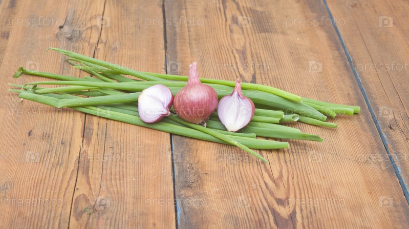 Луковицы красного лука с зелеными листьями на старом деревянном столе