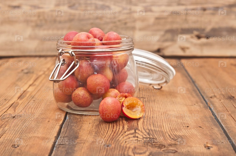 Сливы в стеклянной банке на старом деревянном столе