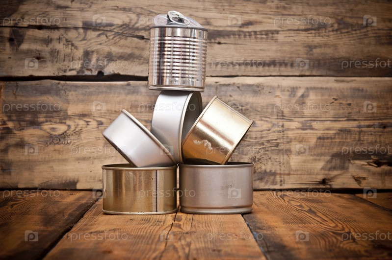 Куча консервных банок на деревянном столе