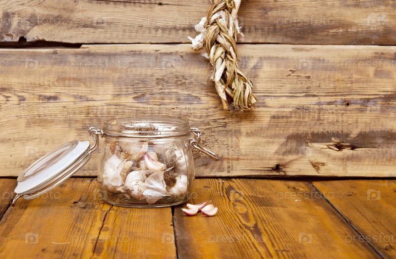 Свежий чеснок в стеклянной банке на старом деревянном столе