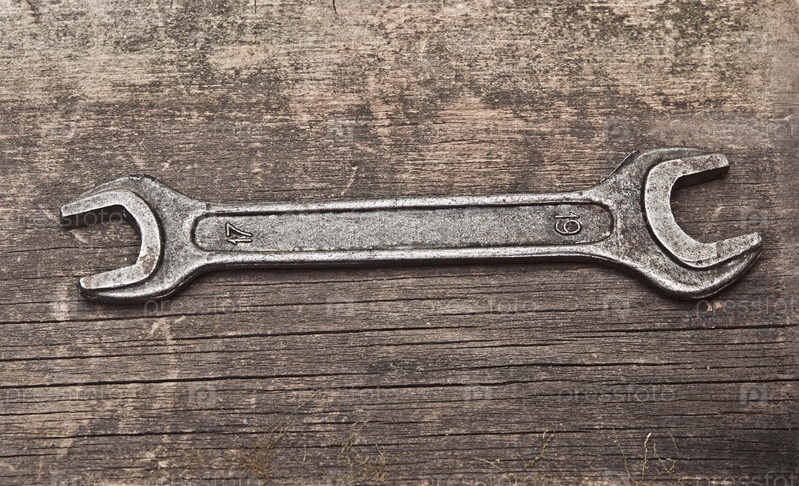 Старый ржавый гаечный ключ на старой древесине