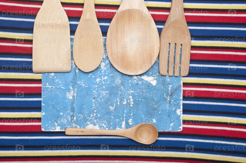 Деревянная посуда и старый лист бумаги на красочной скатерти