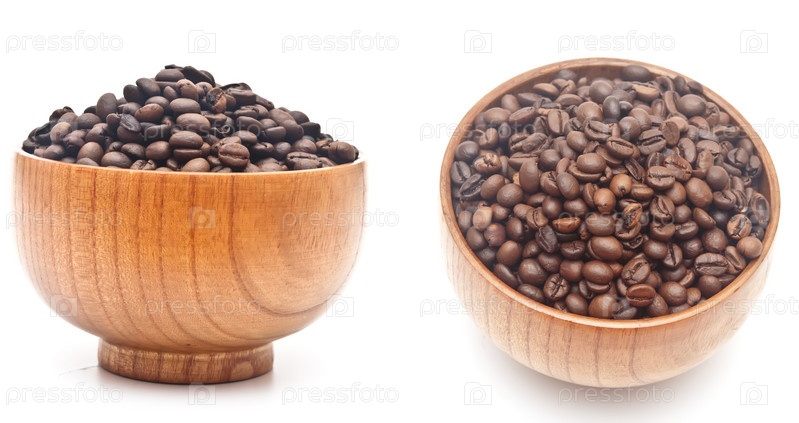 Спелые кофейные бобы в коричневой деревянной миске