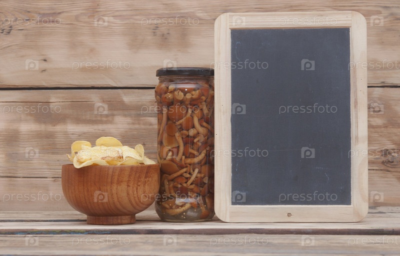 Маринованные шампиньоны в стеклянной банке и чипсы на деревянном столе