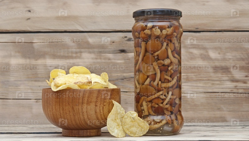 Маринованные шампиньоны в стеклянной банке и чипсы на деревянном столе