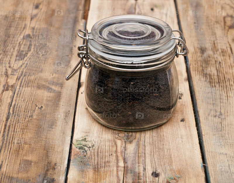 Черный чай в стеклянной банке на старом деревянном столе