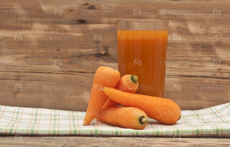 Стакан морковного сока и спелая морковь на салфетке