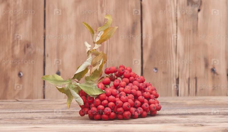 Рябина с листьями на старом деревянном столе