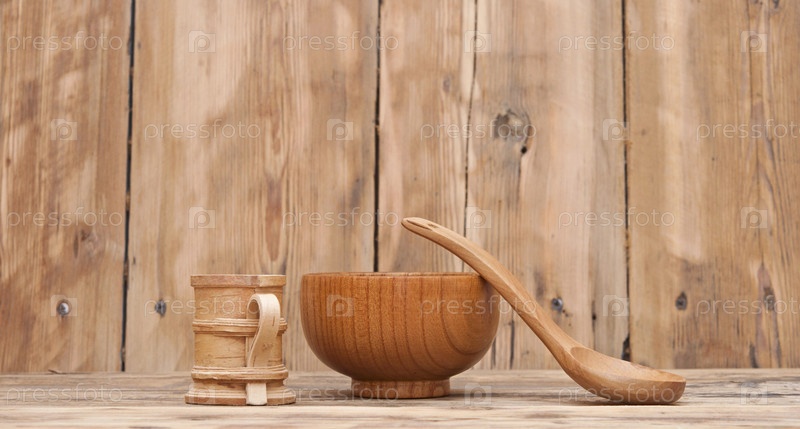 Деревянные кухонные принадлежности на скатерти на деревянном столе