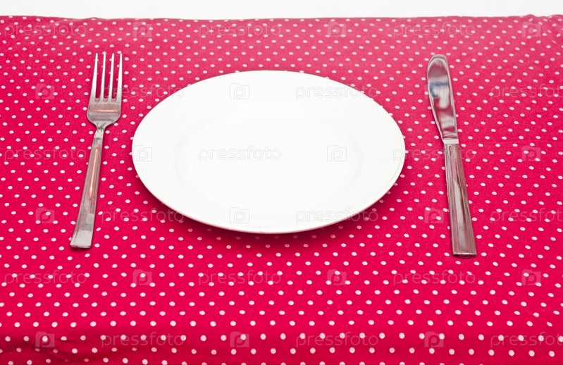 Пустая белая тарелка на скатерти в горошек