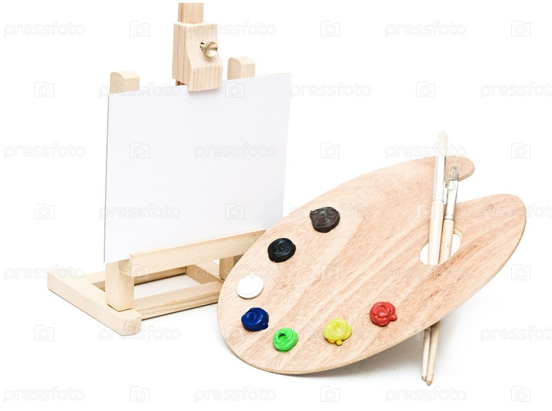 Деревянный мольберт с чистой бумагой и палитра с красками, изолированные на белом фоне
