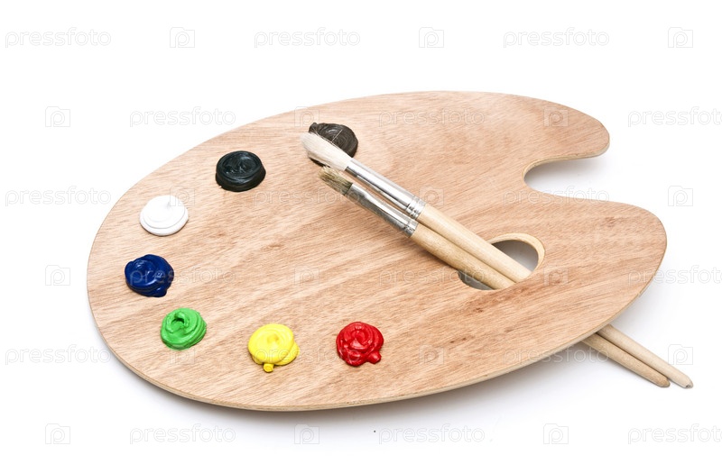 Деревянная палитра с краской и кистями, изолированная на белом