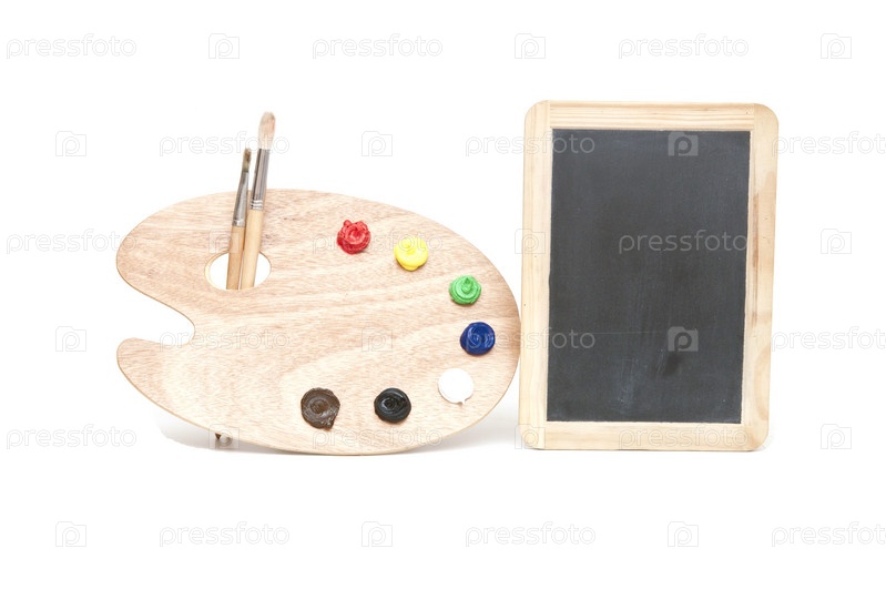 Доска, палитра и карандаши на белом фоне