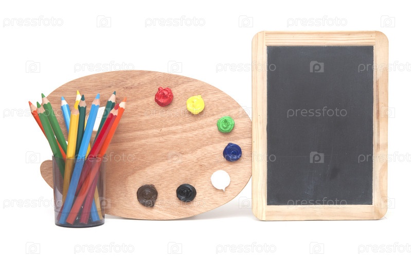 Доска, палитра и карандаши на белом фоне