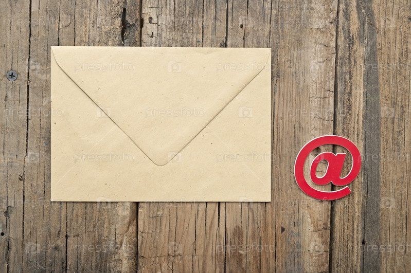 Символ почты и пустой коричневый конверт на досках