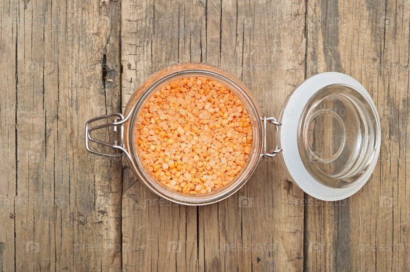 Красная колотая чечевица в банке на древесине