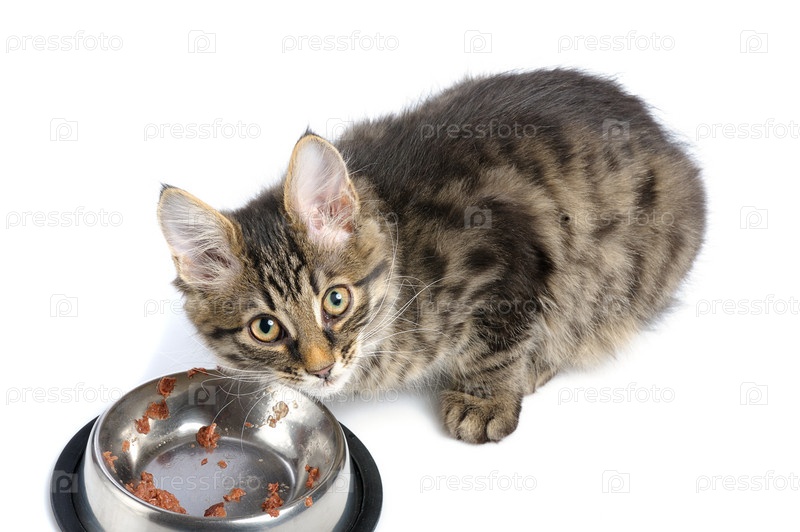 Серый котенок возле миски с едой на белом фоне