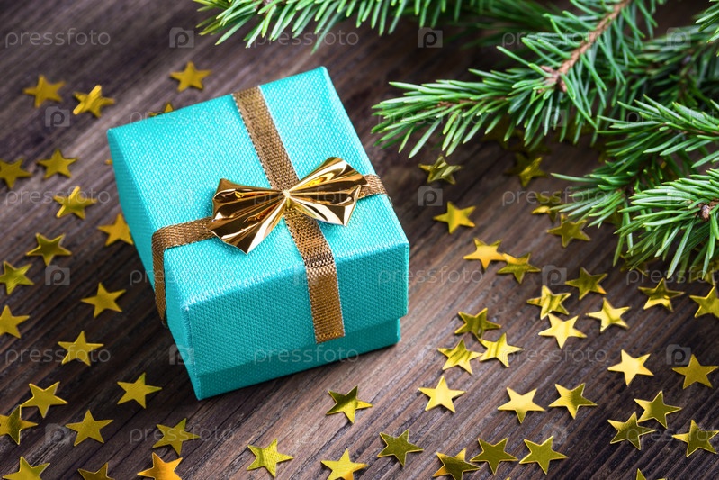 Рождественский подарок со звездами и веточка пихты на деревянном столе