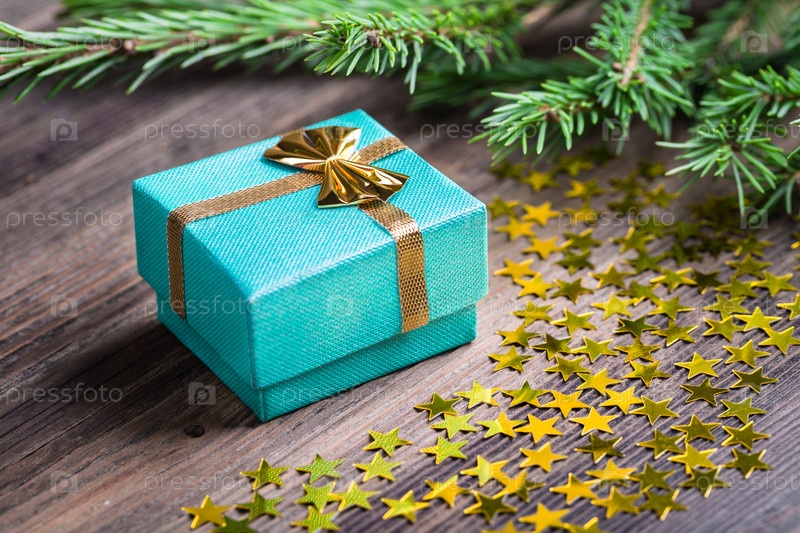 Рождественский подарок со звездами и веточка пихты на деревянном столе