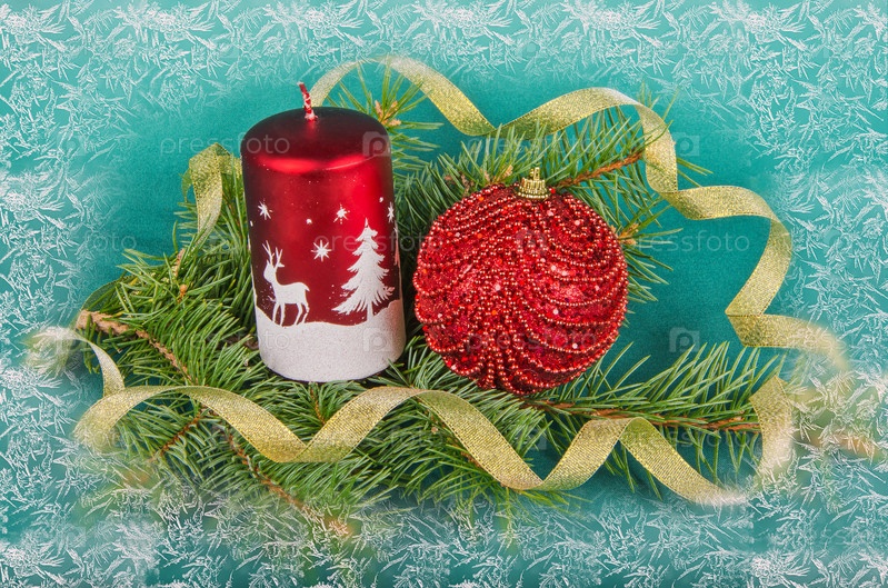 Елочные украшения, свечи и ель