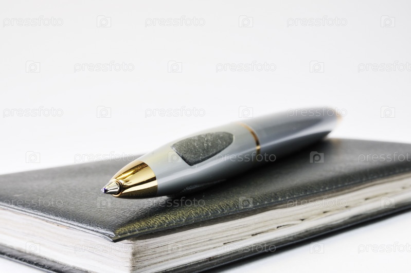 Красивая ручка лежит на черной записной книжке