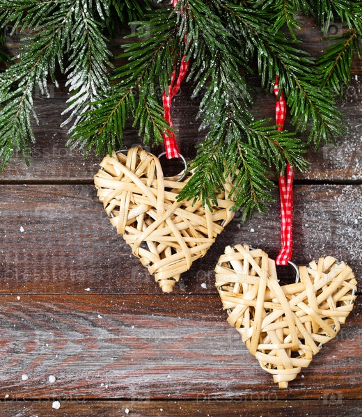 Еловая ветка с новогодними украшениями на деревянном фоне