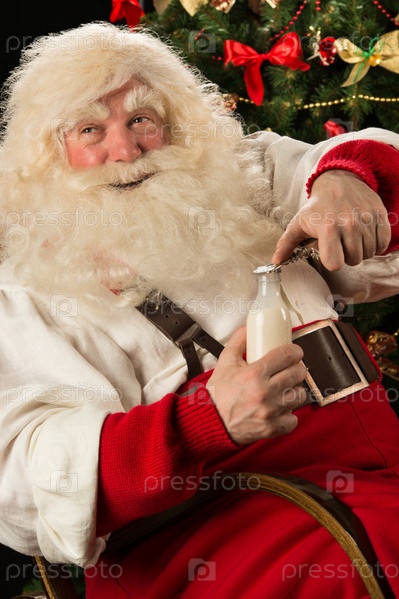 Счастливый Санта-Клаус открывает бутылку с молоком возле елки дома