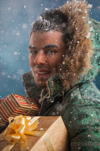 Красивый мужчина держит рождественские подарки на улице в снегопад