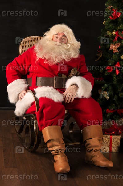 Санта-Клаус сидит в удобном кресле-качалке возле елки дома