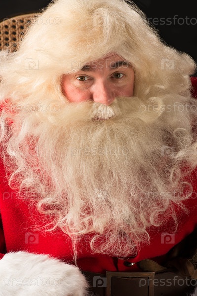 Санта-Клаус сидит в удобном кресле качалке возле елки