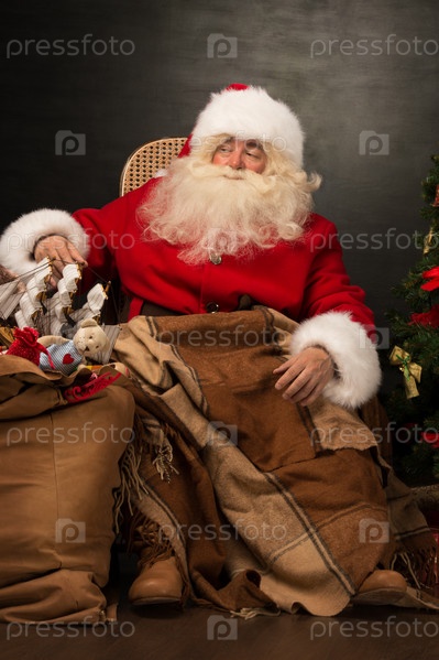 Санта-Клаус с огромным мешком с рождественскими подарками сидит в удобном кресле возле елки