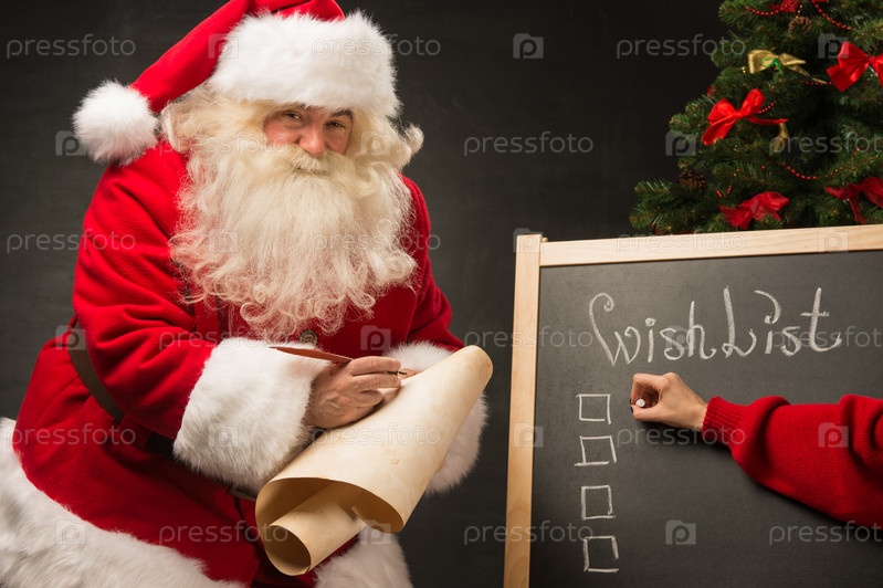 Санта-Клаус и его помощник стоят возле доски с пожеланиями